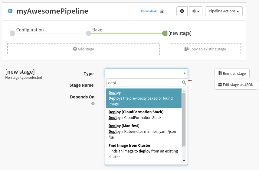 1. Now add a Deploy stage by clicking Add stage again. Select Deploy In the Type drop down list. Deploy’s configuration settings should pop up on the screen.