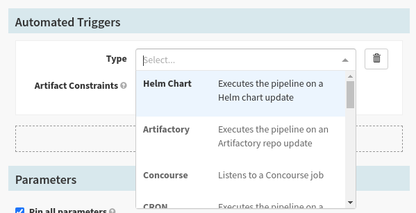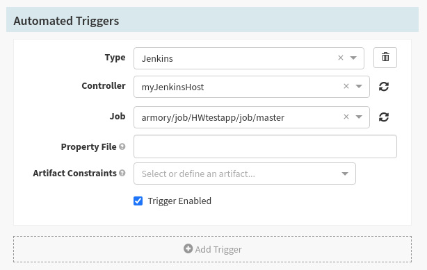 1. Define how your pipeline is triggered. Scroll down to the Automated Triggers section and click Add Trigger. This section enables you to select a Type:
