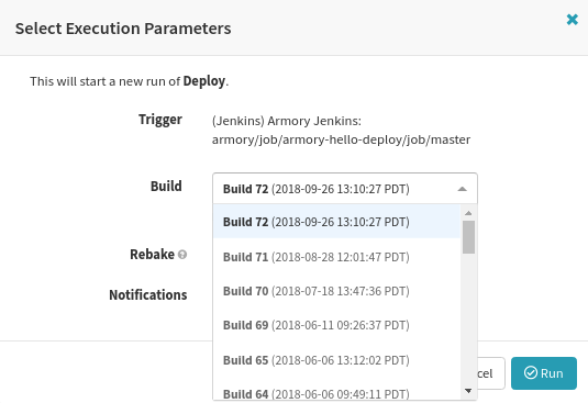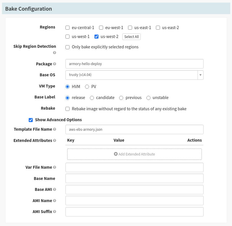 2. You will be able to select a Build for your Jenkins job from a drop down menu. By default, Spinnaker will not recreate an AMI unless the underlying package has changed. If you would like to force it, you may use the checkbox for “Rebake”.