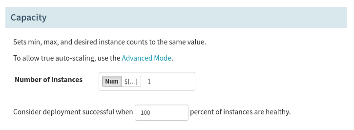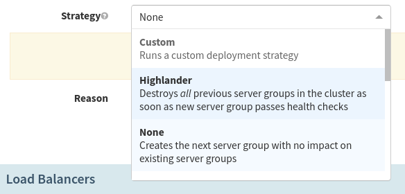 4. It’s important to set up the correct Deploy Strategy for your use case. Use the Highlander strategy for this example, which will ensure that only one server group for your application exists at a time.