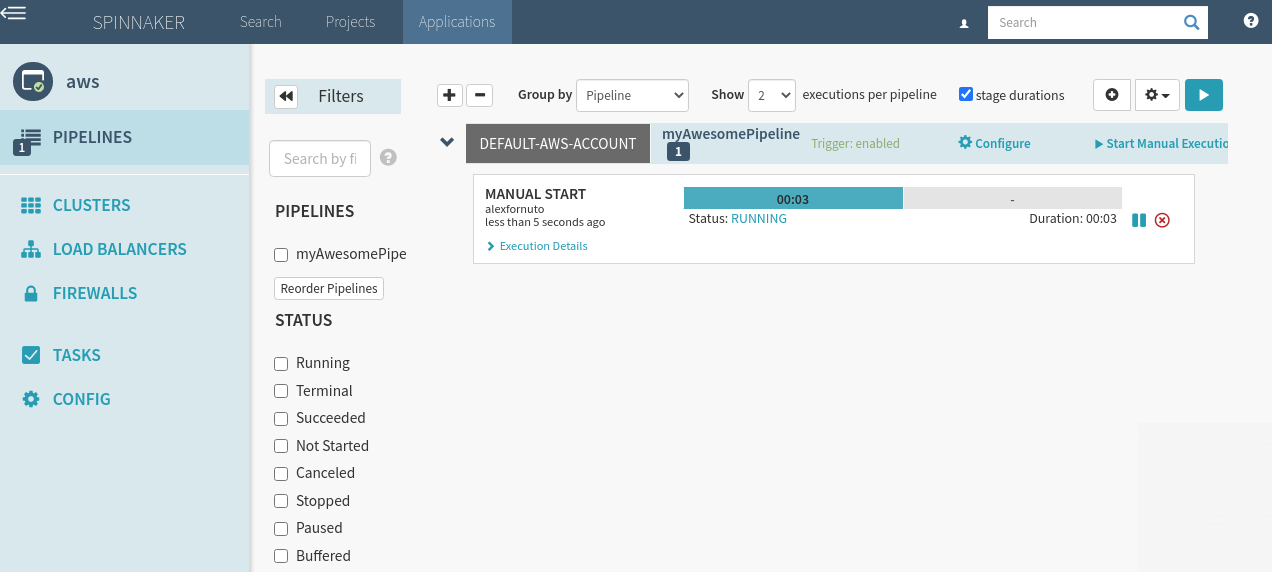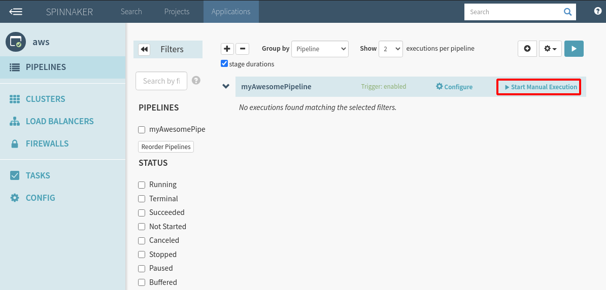1. Click on the Pipelines option. You should see your new pipeline. Click on Start Manual Execution.