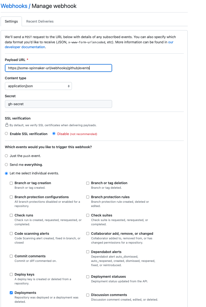 To trigger a Spinnaker pipeline when GitHub creates a new deployment, first create a deployment event webhook in GitHub. Armory strongly recommends you create a secret for the webhook.