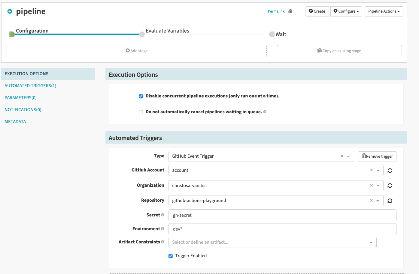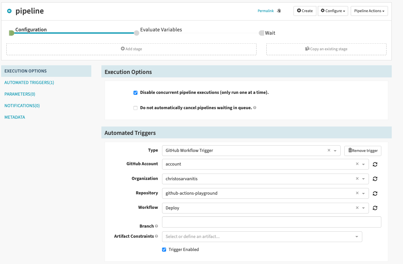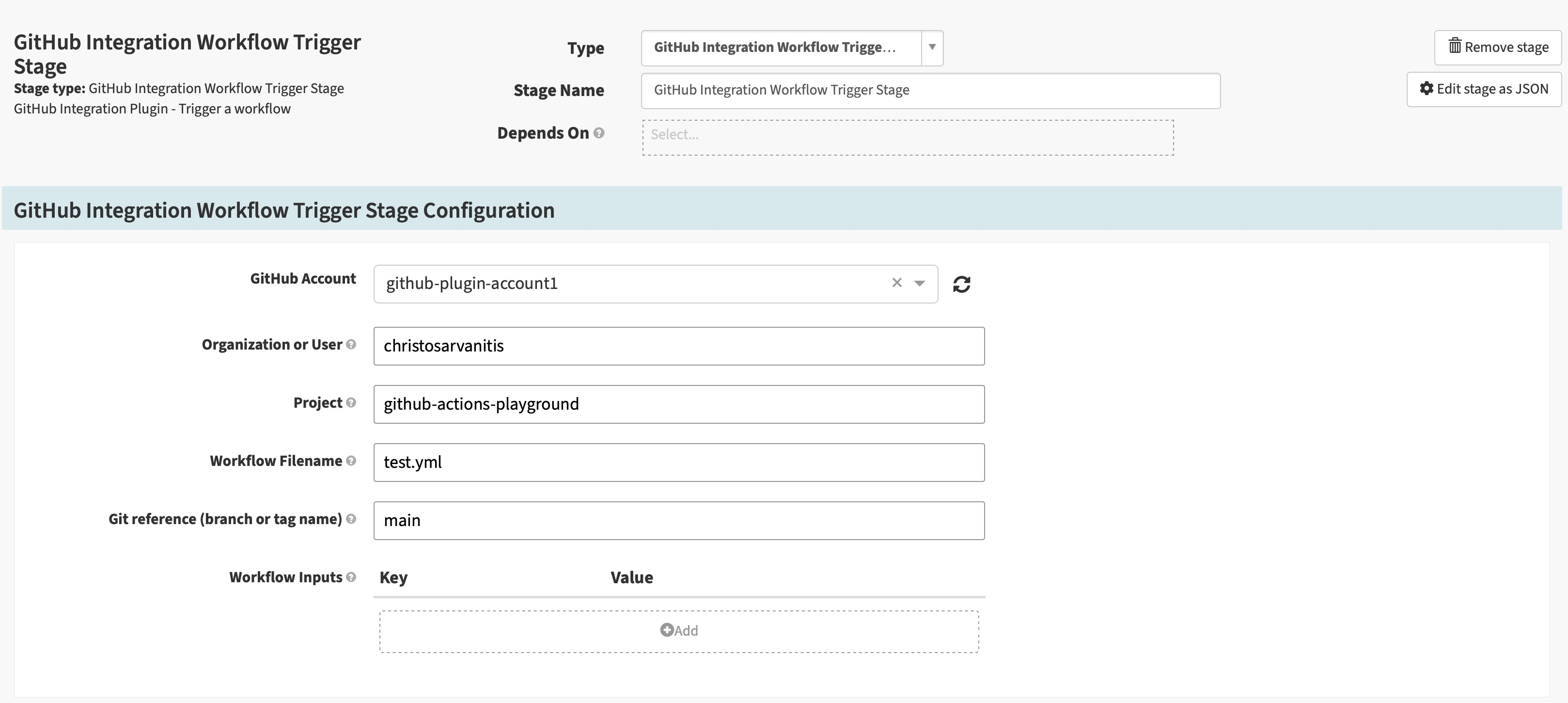 Configure the Github Integration Workflow Trigger Stage as in the following screenshot: